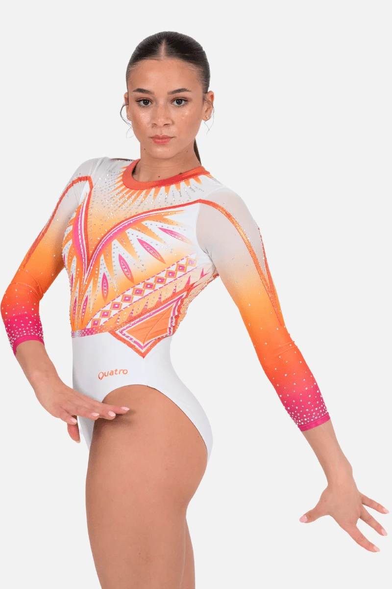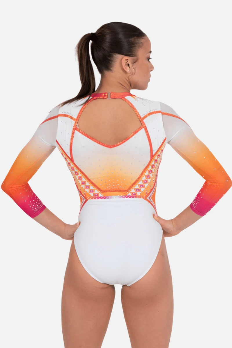 Achieve your best performance with the Accomplish Long Sleeve gymnastics leotard, where bold design meets intricate stonework. Featuring a white lycra body and an eye-catching white and copper orange sublimated lycra bodice, this girl’s leotard makes a stunning statement. The long sleeves are made of white, orange, and cherry sublimated mesh with an ombre effect and scattered with AB and clear stones for a touch of sparkle. The front and back of the leotard are adorned with beautifully arranged stones that create shapes, lines, and curves, making it truly stand out. Copper coral mystique binding, trim, and appliqué add the perfect finishing touch, while the pinched V open back ensures comfort and elegance. With its sparkling stonework, the Accomplish Long Sleeve leotard is a true masterpiece.