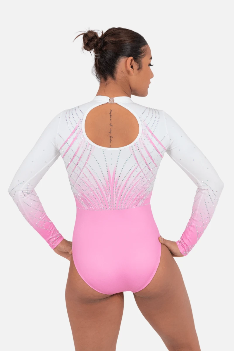 Elevate your gymnastics wardrobe with the stunning Aspire leotard, a design that embodies elegance and sophistication. The leotard features a bubblegum sublimated lycra body, complemented by long sleeves and a bodice in a bubblegum and white sublimated design. Its high collar neckline adds a touch of refinement, while the open back with a secure clasp closure ensures a sleek fit and ease of wear.