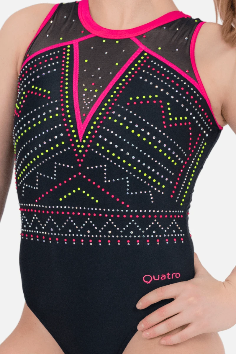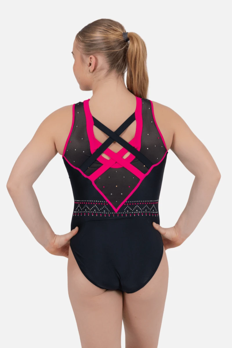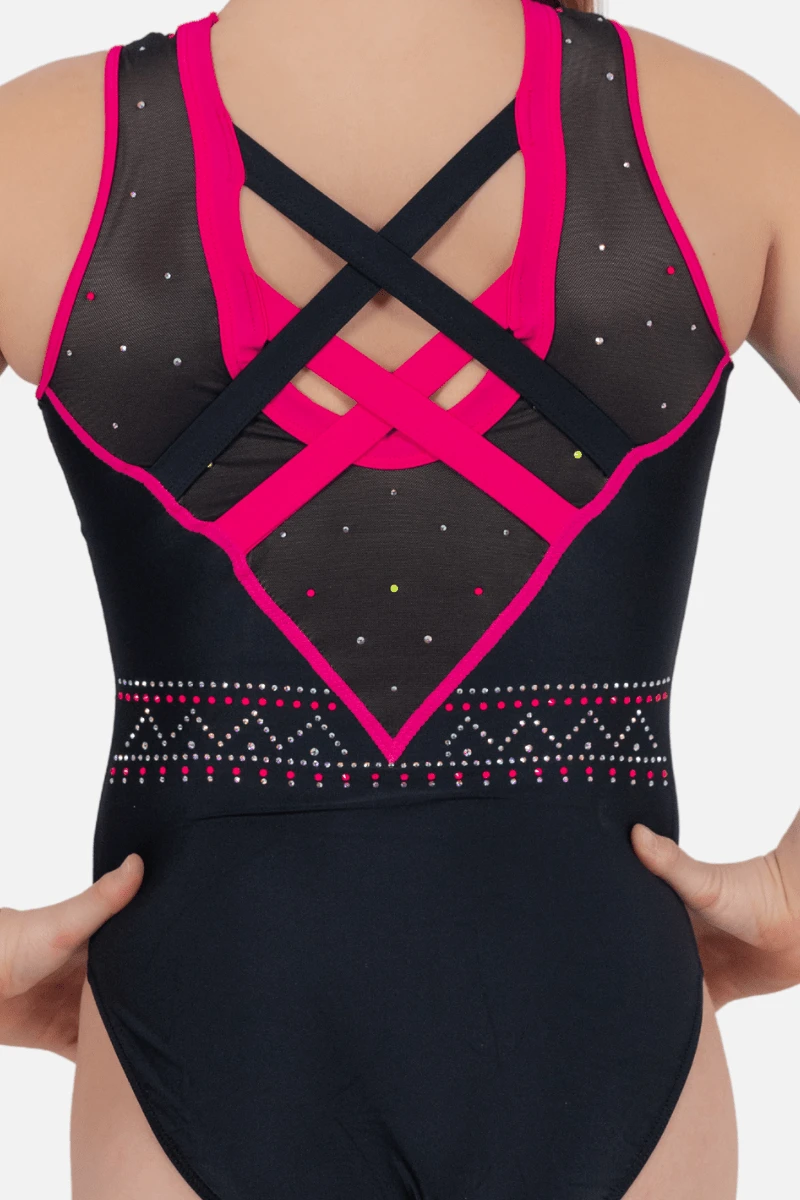 Command attention with the striking Astrid gymnastics leotard, where bold design meets athletic performance. This girl’s leotard features a sleek black lycra body with cherry accents, complemented by mesh inserts for a modern edge. The open back with cherry and black crisscross straps adds a stylish touch, while the AB, yellow, and pink stones in a linear and dotted design bring a dazzling finish. Perfect for gymnasts who want to perform with confidence and style, Astrid is your new go-to leotard for unforgettable routines.