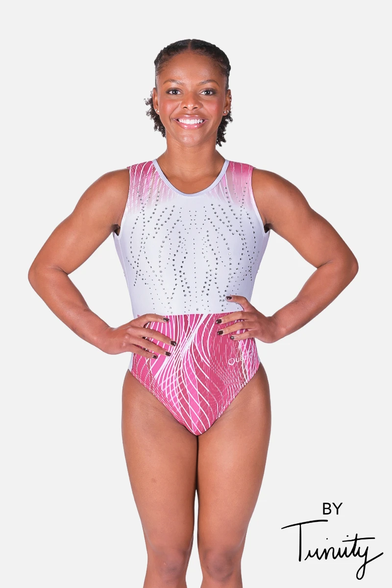 Trinity Thomas wanted a playfully pink leotard and white bodice leotard, and this style definitely delivers! The back is open and features two thin straps, ensuring your training is comfortable and breathable. Adorned with crystals, this original piece is a fan-favourite! Add some style to your training with Trinity’s new style, available to shop now!