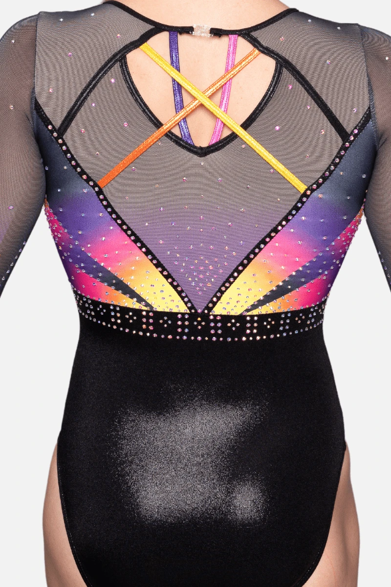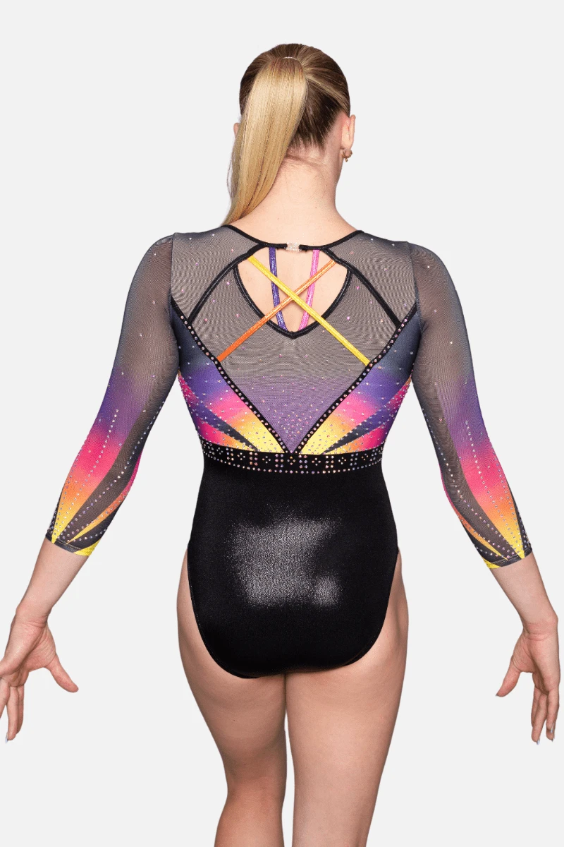 Radiate confidence in Charisma, a showstopping 3/4 sleeve gymnastics leotard. Layers of beautiful details make this a true standout piece. Featuring a black Mystique body and a bold ombre of orange, yellow, cherry, and purple on the bodice and sleeves, adorned with sparkling stones, patterned stone belt, and thin crisscross straps, Charisma is a must-have design for those who want an elevated look.