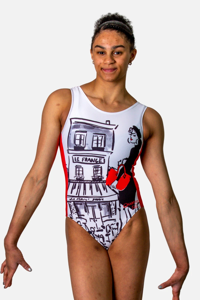 Introducing Chic from our Paris-inspired collection, a leotard that exudes sophistication. Adorned with a hand-illustrated Parisian scene on luxuriously soft lycra, complemented by striking red side panels. The black lycra back features a charming heart design, adding a touch of sophistication to your gymnastics wardrobe.