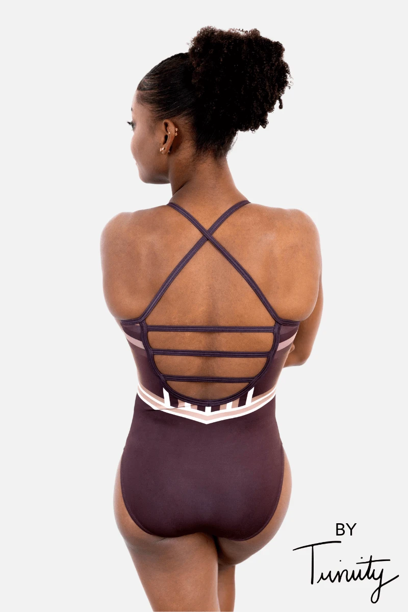 Introducing Coco by Trinity Thomas. This original brown leotard with white and brown detailing and interesting back is your next favorite leotard!