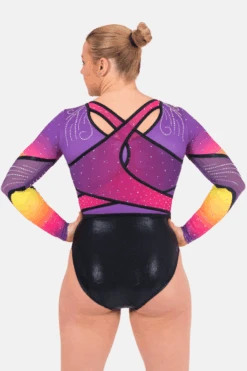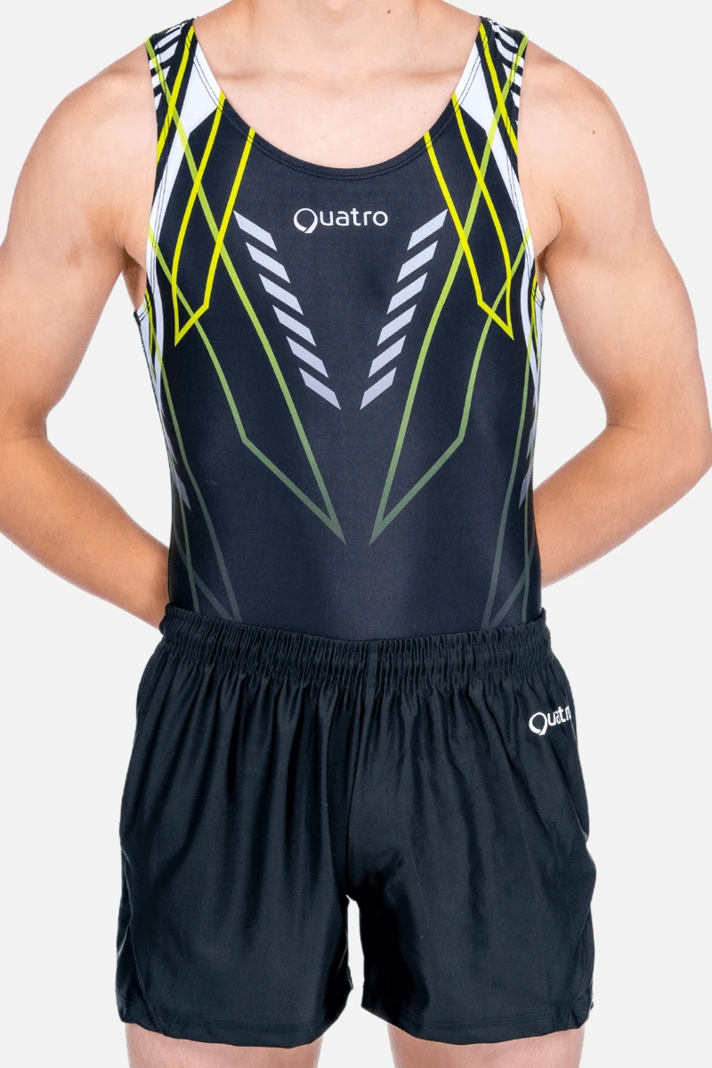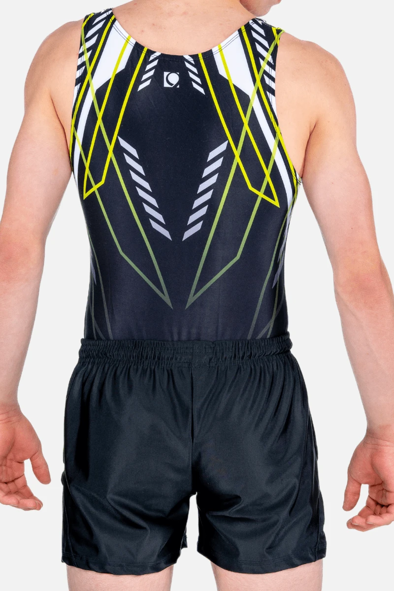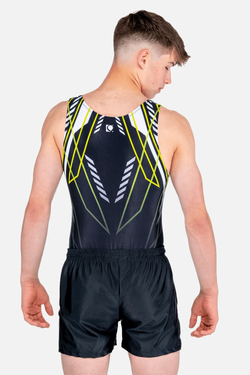 With its striking lime and white chevron pattern against a sleek black canvas, the Delta men’s leotard exudes effortless coolness. Crafted with precision, its bold line work and shapes create a streamlined silhouette, ensuring you stand out with confidence in every performance.