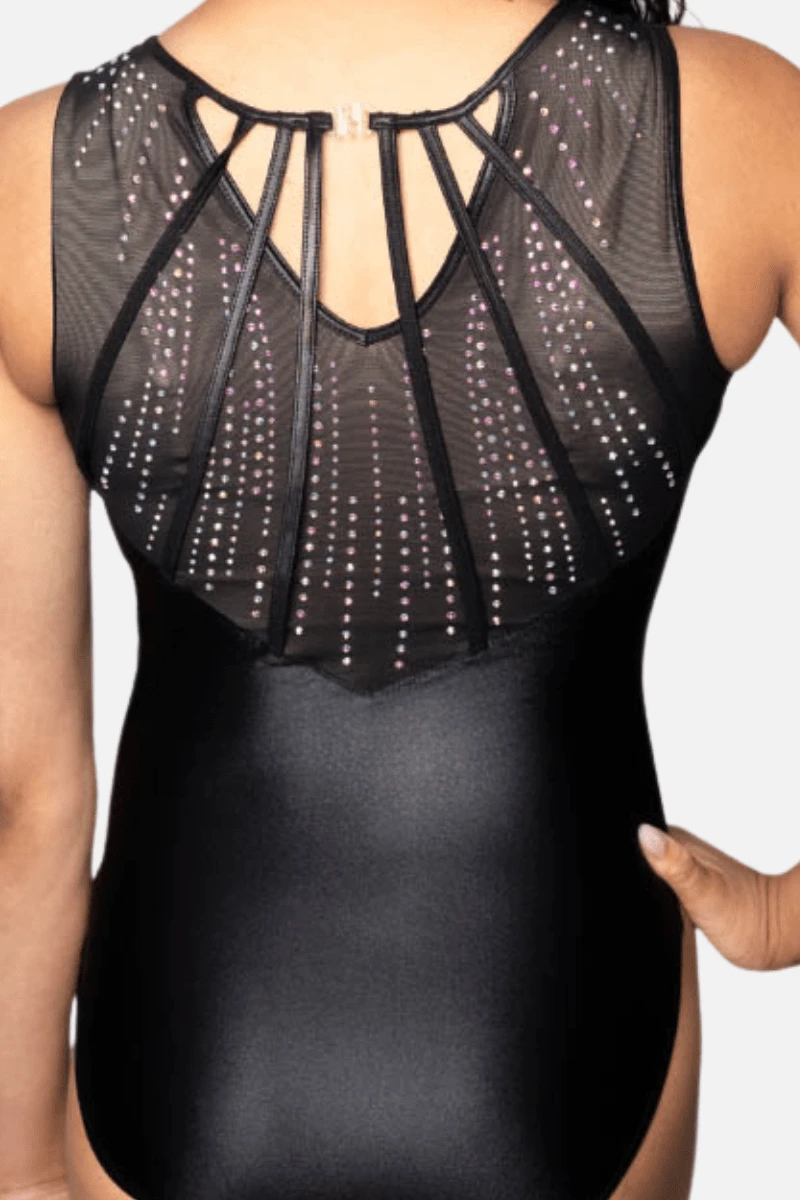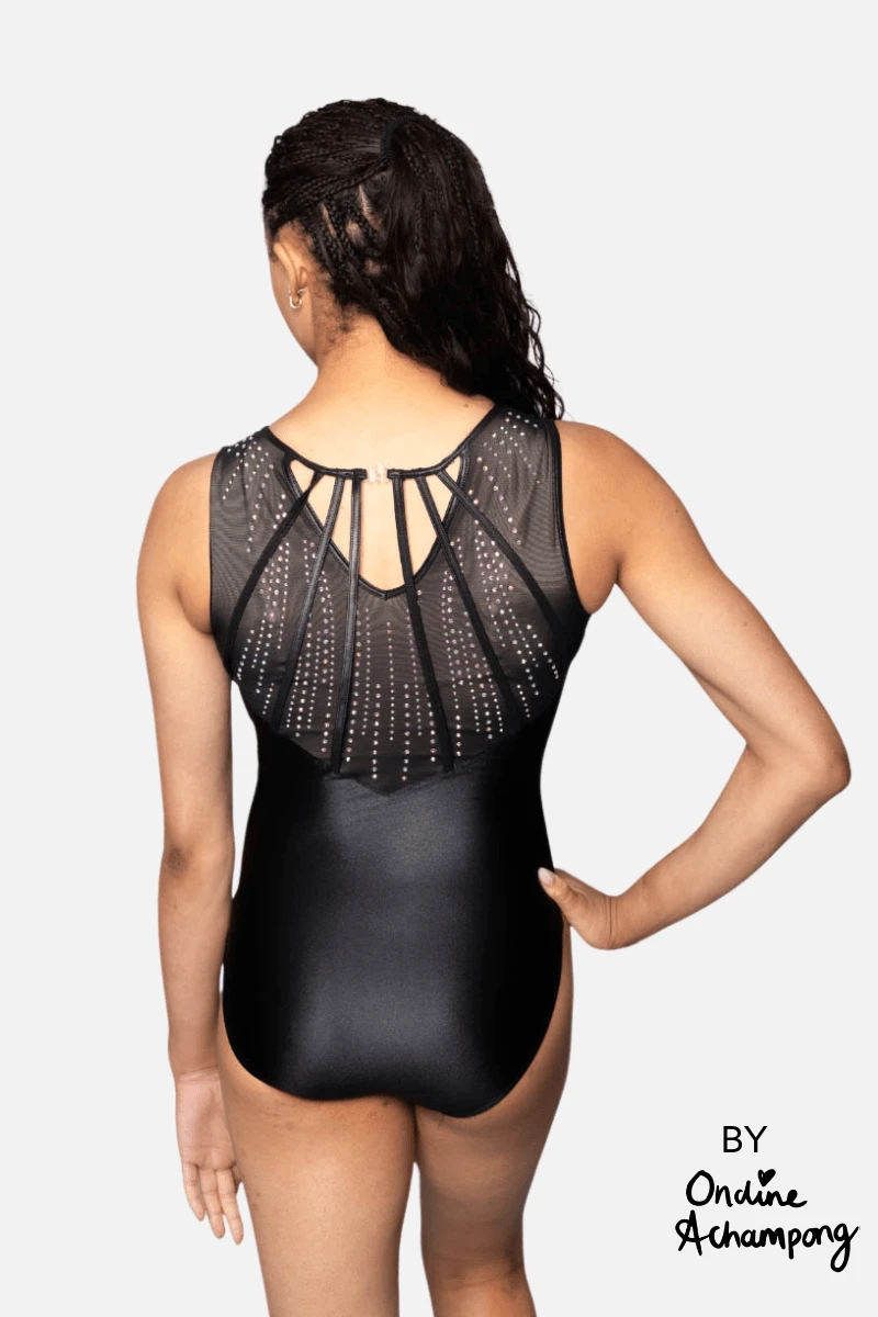 Designed by Ondine Achampong, the Diamonds leotard is a sleek, black wet-look lycra masterpiece. It features a round neck with a V-back and thin straps that overlay to the waist. Sparkling stones at the neckline create the illusion of a necklace, leading to an asymmetric design down the bodice for a chic and modern touch.