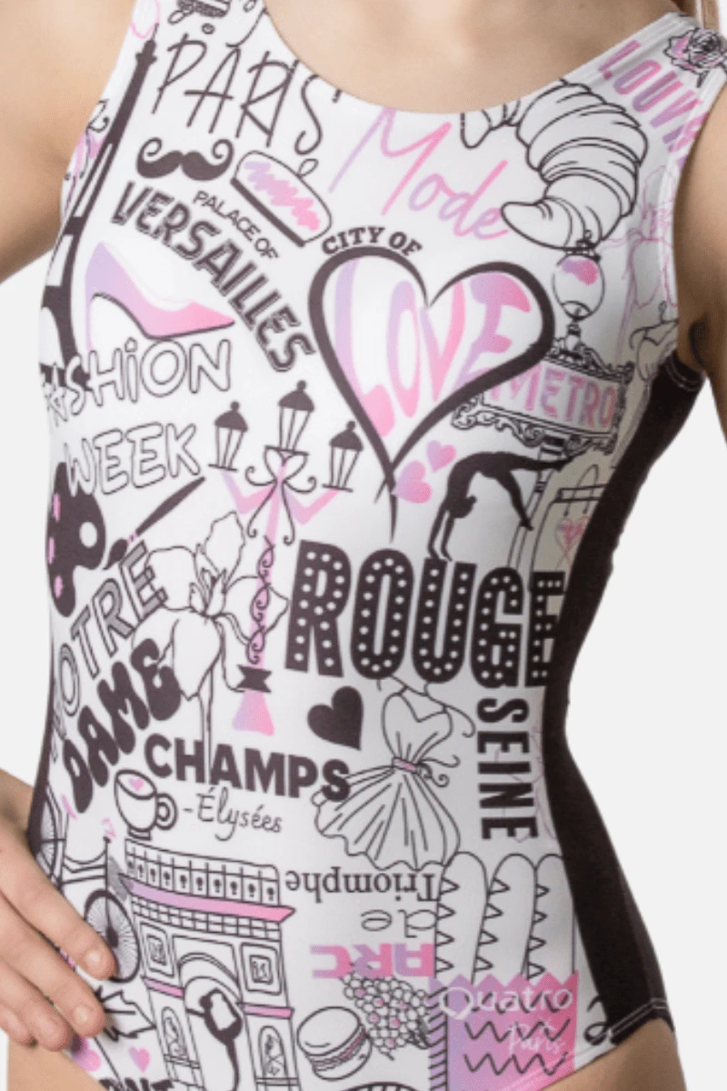Meet Elegant from our Paris-inspired collection, a fusion of fun and sophistication. Crafted from luxuriously soft lycra, adorned with a funky hand-drawn design, capturing the essence of Parisian charm. Enhanced by sleek black side panels, this leotard embodies both style and grace, making it the perfect choice for elevating your training sessions with a touch of Parisian flair.