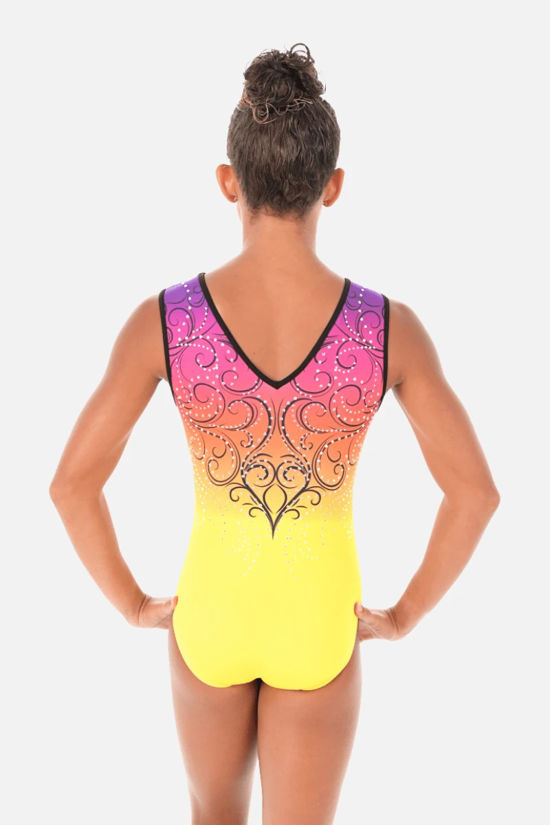 The Lantern leotard is a dazzling fusion of colour and style. This vibrant girl’s leotard design features a stunning purple to yellow ombre, seamlessly blending the hues in a vibrant gradient. The leotard is enhanced by a striking swirling pattern that dances across the body, adding a dynamic and energetic flair. The V-neckline at both the front and back accentuates the silhouette, Lantern promises to be a show-stopper!