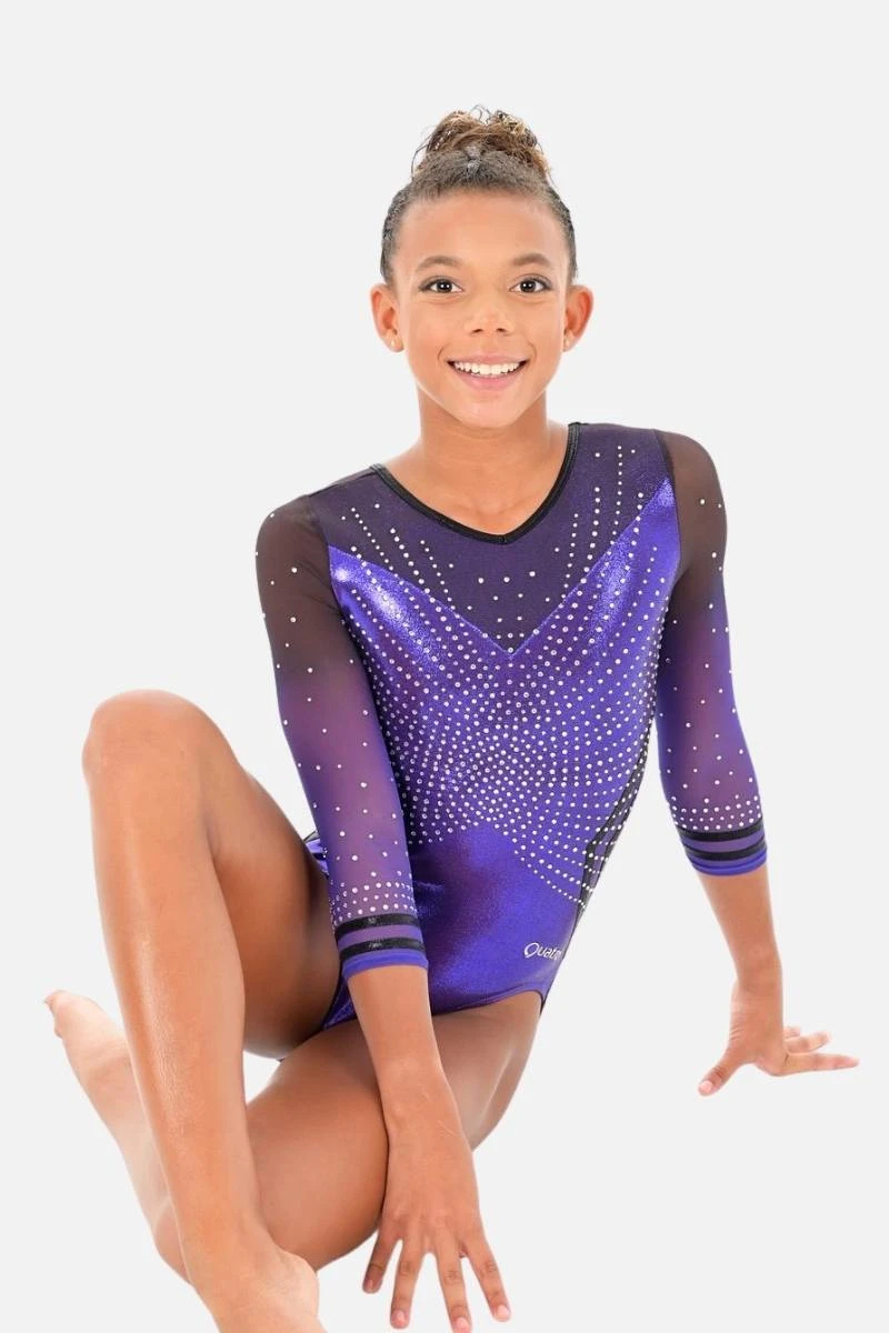 Liberty Purple has a purple mystique body with an intricate stone design across the front and back of the leotard continuing down the sleeves. Black mystique trim accentuates the waist & cuff of the 3/4 length sleeves. It has a black to purple ombre mesh overlay across the bodice & the sleeves are also black to purple ombre mesh.