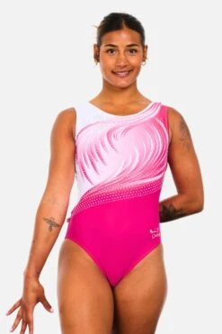The Libre leotard, designed by Olympian Marine Boyer, is a bold and elegant design created for the French National Gymnastics Championships. Featuring a rich cherry lycra body, this girl’s gymnastics leotard exudes strength and sophistication. The bodice is crafted from cherry, bubblegum, and white sublimated lycra in a delicate feather pattern that flows effortlessly across the design. A round neckline at both the front and back provides a comfortable yet classic fit, while white lycra binding adds a crisp, clean finish. The leotard is brought to life with AB stones that follow the feather pattern, creating a dazzling sparkle with every movement. Complete with Marine Boyer’s silver embroidered signature and the Quatro logo, this leotard is the ultimate combination of elegance and elite performance.