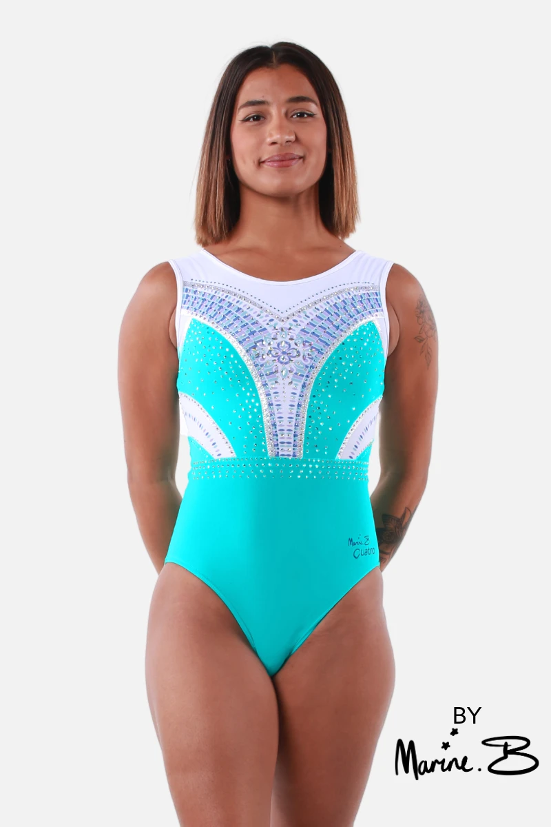 Designed by Olympian Marine Boyer, the Maroc leotard is a vibrant and eye-catching girl’s gymnastics leotard. It features a striking mint lycra body complemented by a sublimated mesh bodice adorned with a beautiful pattern and sparkling stonework. The standout detail is a stunning flower design at the centre front. With a scooped low back, this leotard combines elegance with a fresh, modern flair.