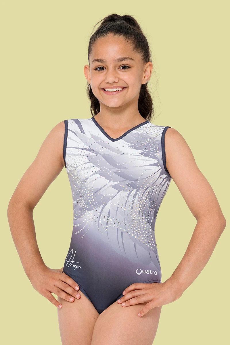 Meet Odette, a graceful and powerful leotard inspired by the iconic white swan in Swan Lake. Designed as the women’s counterpart to Heath Thorpe’s Odile, this leotard features black, white, and grey sublimated lycra in a feathered design that flows across the bodice. The feather motif is elevated with swirling and layered stonework that brings the whole look to life under the lights. A flattering V-neck front meets a deep V-back, finished with two thin crossover straps that add structure and style. A perfect addition to our girls gymnastics leotards collection, Odette is for gymnasts who want elegance, edge, and a little theatrical flair.