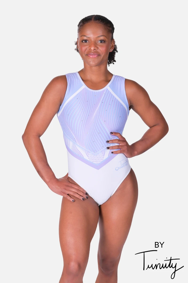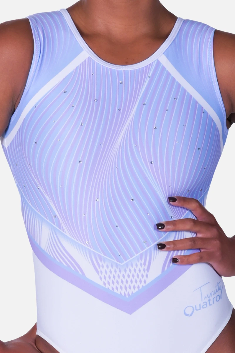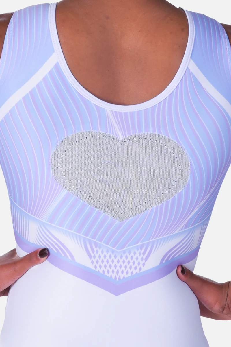 Pale blues and purples sweep into a whimsical design carried through the front and back of the leotard. An original Trinity Thomas X Quatro Gymnastics leotard, the back features a mesh heart to bring you all the gymnastics love you need! Shop this unique and cute design by Trinity Thomas.