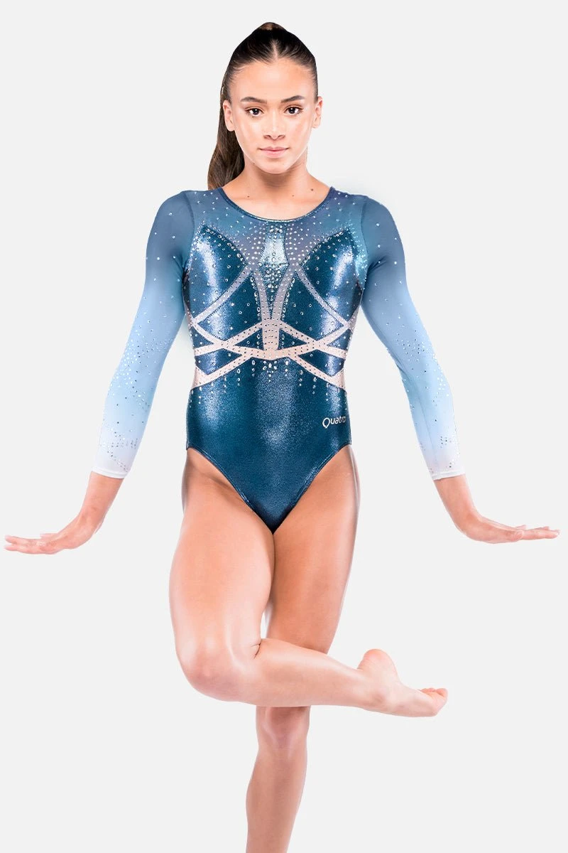If you are looking for the perfect competition leotard, look no further! The Runway long sleeve leotard offers class and safistication with a stunning stone pattern, ombre mesh and intricate applique. The mystic body provides the best comfort and durability for any routine.