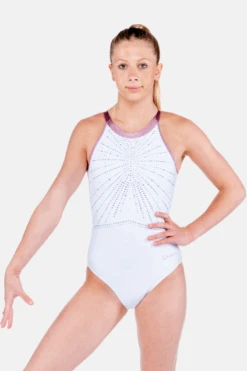 Introducing the showstopping Shimmer girl’s gymnastics leotard, created to elevate your gymnastic performance. Featuring a sophisticated high-neck design accentuated with blush pink binding and clasp closure, and a stunning open back with blush mesh. The bodice dazzles with a burst of sparkling stones, complemented by a gem belt.