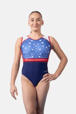 Unleash the spirit of the USA with our sensational Stars gymnastics leotard. Featuring a navy lycra body, and white mesh elegantly lined. The standout red mystic trim and appliqué, along with a chic side cutout and crisscross strappy back, exude confidence and style. The stunning sparkly star design on the bodice and dazzling stone belt make this girls leotard a true embodiment of gymnastic excellence.
