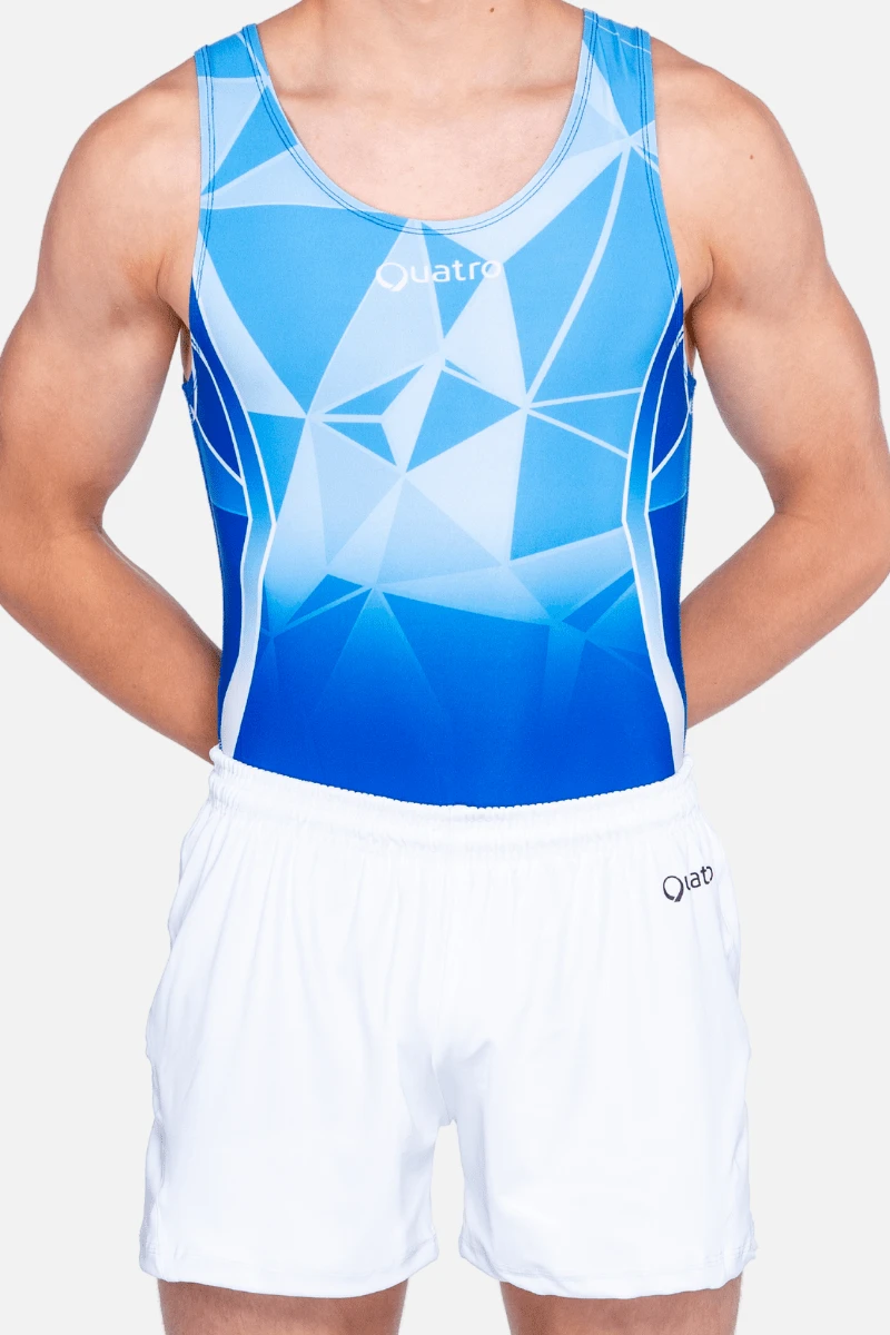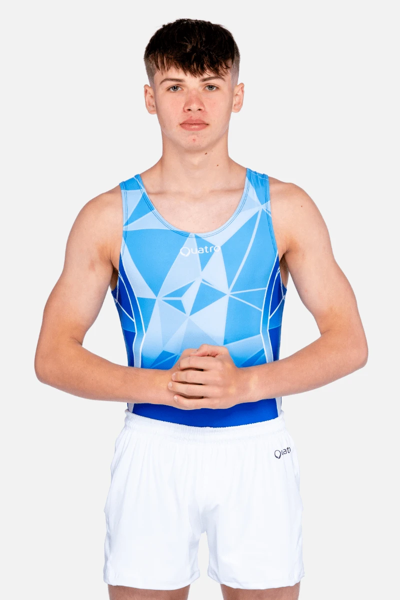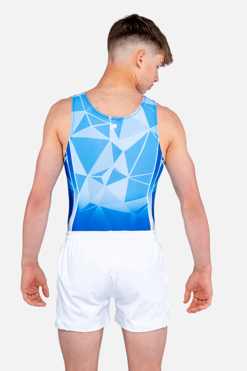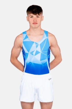 Unleash performance and style with the Thorne men’s gymnastics leotard, designed for a superior fit and maximum comfort. Crafted from royal blue and white sublimated lycra, this leotard features a dynamic geometric design on the body and angular side panels for a bold, athletic look. Cut with our top-notch singlet pattern, it’s tailored to the male physique for an exceptional fit. The boxer-cut leg design prevents bunching, providing freedom of movement throughout your routine. Whether you’re competing or training, the Thorne leotard ensures you look and feel your best. Complete the look with white shorts.