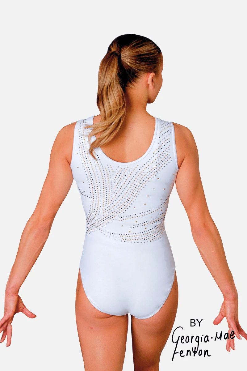 Introducing Georgia Mae Fenton’s British Championship Replica leotard, a vision of pure elegance. Dazzle in this all-white design adorned with sweeping clear, black and gold clear stonework on both front and back. Truly spectacular, you’ll command attention on the floor with every move in this breathtaking piece. Don’t just shine, sparkle with unmatched radiance in this extraordinary leotard.