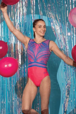 Part of our Fearless and Bold Collection, the Viva girl’s gymnastics leotard is a celebration of movement, colour, and confidence. The vibrant orangeade pink lycra body sets the stage for a stunning, fully sublimated bodice that blends pink and royal blue in a dynamic tribal-inspired design.